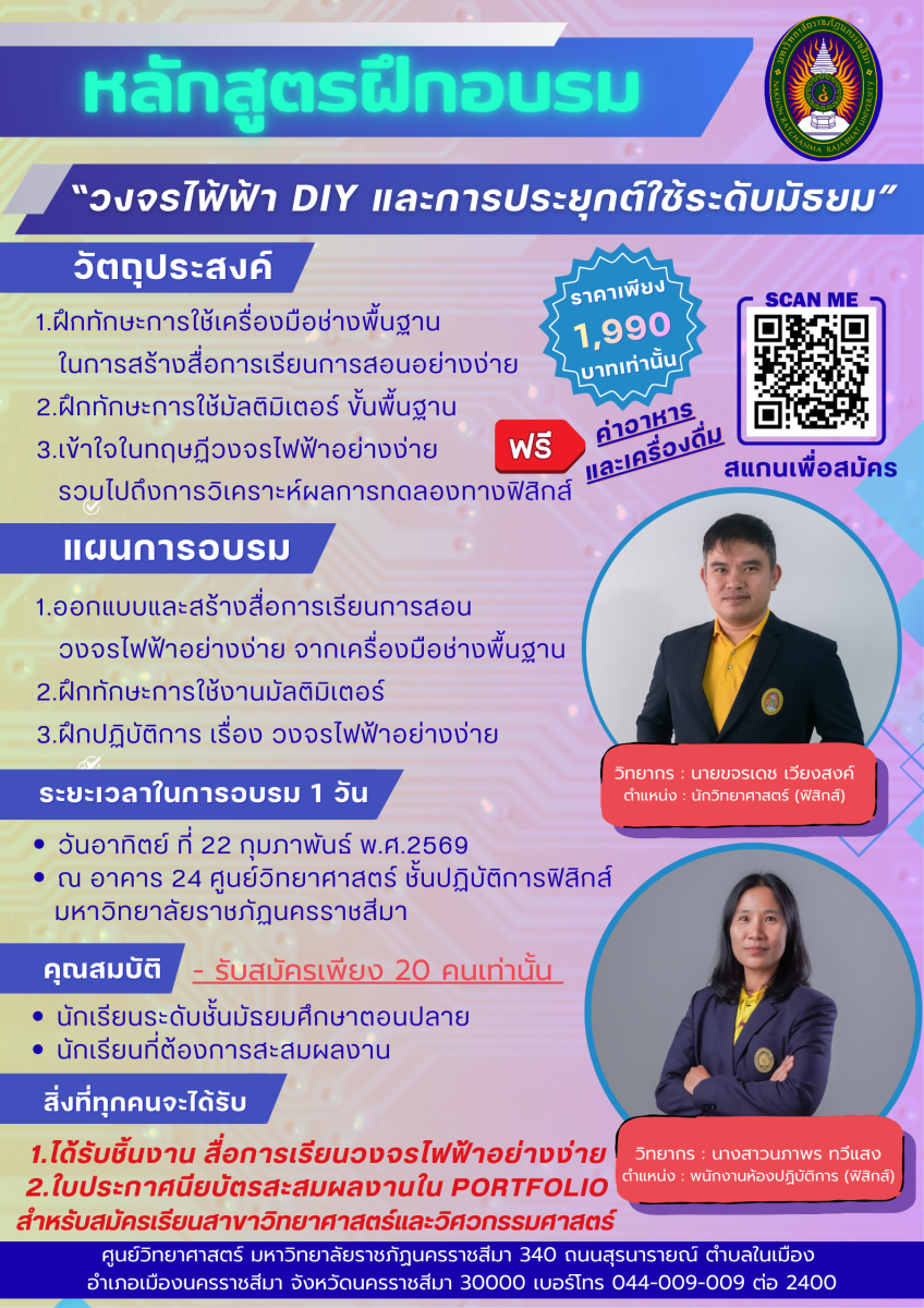 โครงการอบรมหลักสูตรระยะสั้น เรื่อง “วงจรไฟ้ฟ้า DIY และการประยุกต์ใช้ระดับมัธยม” วันอาทิตย์ที่ 22 กุมภาพันธ์ พ.ศ.2569